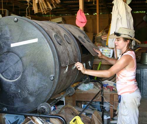 In the photo above, Perry-winkle farmworker Chris opens the compost tumbler which they use to mix their own special blend of potting mix. They augment commercial soilless mix (Fafard #2) with vermicompost (worm castings), rock phosphate, and bloodmeal for their transplant mix.Perry-winkle employs 3-5 part-time farmworkers throughout the season.