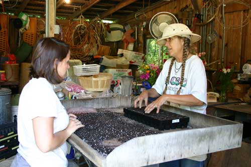 Cathy instructs volunteer Corrie-Lynn on how to fill the seeding flats with the fresh soil mix. Perrywinkle benefits from several volunteer farmworkers throughout the season, usually people who want a rural farm experience. They get paid in veggies and flowers!