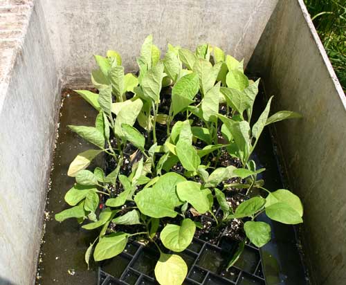 The fish emulsion provides a nice boost of nitrogen to the plants to give them a head-start after planting. Each flat soaks until fully saturated, ensuring that the transplants are well-watered before planting.