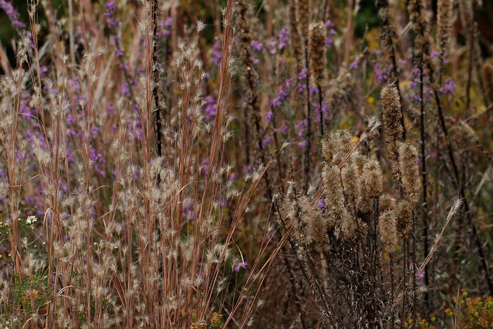 Seedheads of ironweed and bee balm against a backdrop of pink muhly grass in the late fall. Photo by Debbie Roos.